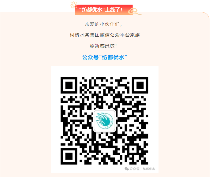 下一步,我們將對“紡都優水”公眾號菜單功能進行進一步優化完善,屆時可直接跳轉接入“柯橋水務”服務號。同時,持續加強新媒體陣地建設,構建立體傳播形態,更好地服務廣大用戶。期待您的關注!