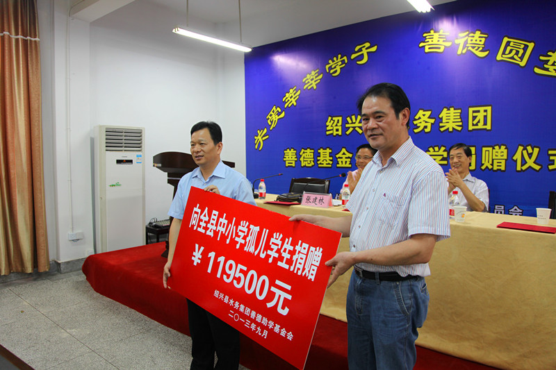儀式上,集團倪董事長介紹了“善德基金”基本情況,并現場向今年受助的全縣81名中小學孤兒學生捐贈了“善德基金”助學款119500元,資助標準為小學生每人每學年1000元,初中生每人每學年1500元,高中生每人每學年2000元,并從今年開始對全縣孤兒從小學到高中讀書期間每年給予捐助。縣教體局局長蔣國洪以及縣老領導、縣關工委主任李會鵬分別作了講話,他們對集團強烈的社會責任感以及情系困難學生的善心義舉給予了高度的肯定和贊揚,希望受助學生學會堅守,學會感恩,學會奉獻,并呼吁社會各界為孩子們快樂成長、展翅高飛而共同努力。