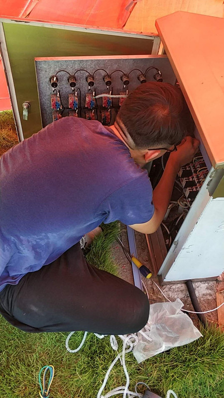 排水公司的自控維修人員在將近40℃的高溫下安裝自控設(shè)備,調(diào)試各項參數(shù)。