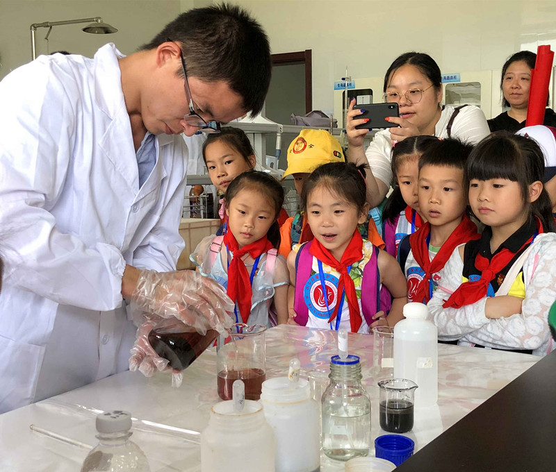 “經過三天三夜,混濁的污水就這般變得干凈了。現在,讓我們把這個時間縮短,來一次奇跡的見證。”實驗室里,學生們圍繞在實驗試劑的瓶瓶罐罐旁,平日里嚴謹的實驗技術人員瞬時變成了神奇的魔術師。“這就是我們平時未經處理的工業印染污水,只有通過一系列的污水處理環節,污水才能被排放至河流和大海中。”實驗室技術人員拿出用作處理污水的專業試劑,開始帶領學生做“污水絮凝沉淀”實驗。用膠頭滴管吸取試劑,使用玻璃棒攪拌、靜置,通過一系列的專業步驟,一杯杯污水慢慢地開始變清。“這就是絮凝沉淀實驗,通過加入‘混凝劑’,水中的污染物被不斷凝聚,最終沉淀至燒杯底部,從而使污水變清。”學生們一邊認真聽講一邊情不自禁“哇,水變清