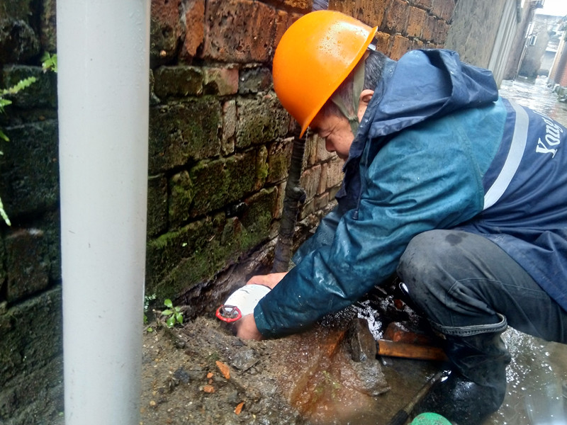 圖為管網養護員冒雪在柯橋街道紅升景園疏通生活污水管道