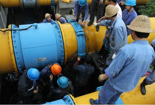 當(dāng)時(shí),工作人員正在現(xiàn)場(chǎng)巡視,實(shí)然發(fā)現(xiàn)市排DN800管道流量計(jì)后硬性伸縮節(jié)滲漏噴水,于是立即按照?qǐng)?bào)告制度進(jìn)行匯報(bào),該公司立即啟動(dòng)應(yīng)急預(yù)案。搶修分兩路展開(kāi),一隊(duì)人員用應(yīng)急水泵,將滲漏的污水打入生產(chǎn)系統(tǒng)中;另一隊(duì)人員對(duì)滲漏點(diǎn)進(jìn)行檢查,確定是因硬性伸縮節(jié)的兩顆螺絲膨脹后崩斷造成爆管。在通知排水公司對(duì)進(jìn)廠(chǎng)流量進(jìn)行控制的同時(shí),現(xiàn)場(chǎng)搶修指揮人員立即組織維修人員對(duì)硬性伸縮節(jié)進(jìn)行更換。維修人員在采取相關(guān)安全措施后,冒著不斷噴出的污水,立刻進(jìn)行拆裝螺栓作業(yè)。隨著水流一點(diǎn)點(diǎn)變小,漏點(diǎn)最終被徹底控制。