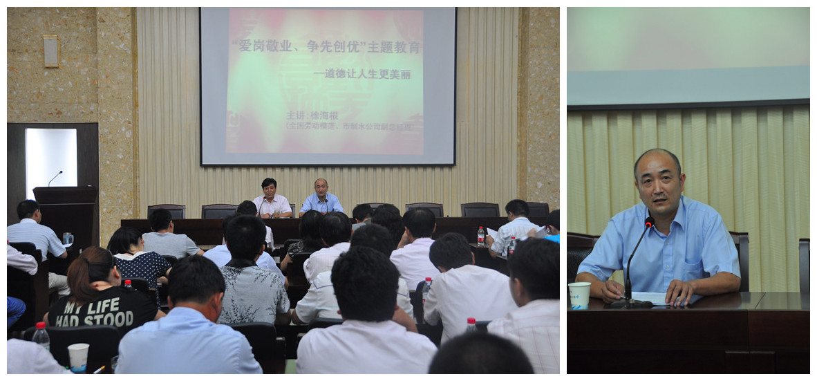 8月11日下午,公司邀請全國勞動模范、紹興市制水公司副總經(jīng)理徐海根為公司班組長以上管理干部作題為《道德讓人生更美麗》的宣講教育,共80余人聆聽了模范的精彩宣講。會上,徐海根結(jié)合自身工作實際,用樸實的語言從職業(yè)道德、責任心、愛崗敬業(yè)等方面講述親身經(jīng)歷的感人故事,感人至深,催人奮進。與會的每個人在這里接受了一次心靈的洗禮,取得較好的效果。