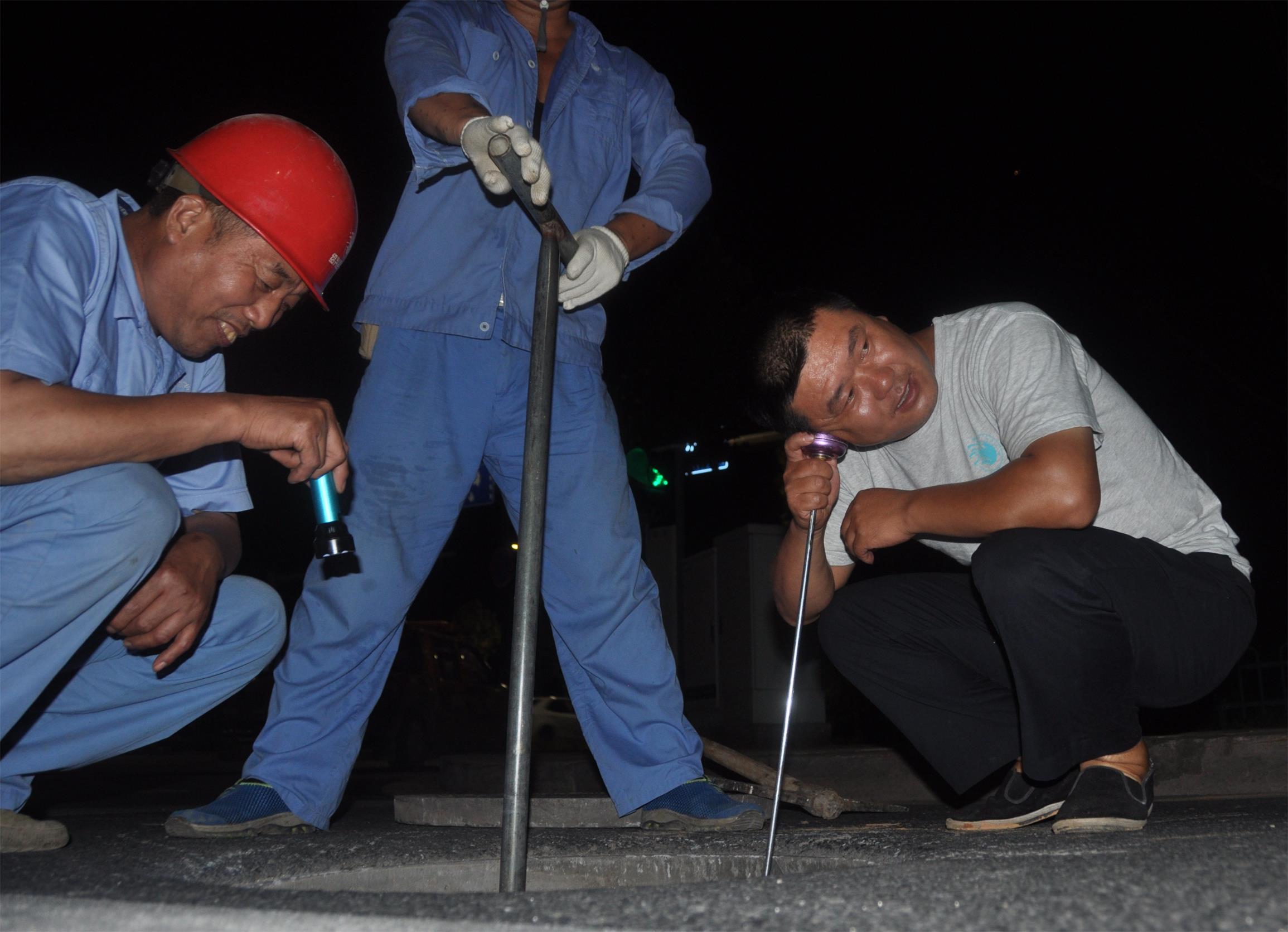 為進一步降低水量漏損,8月8日晚,城區(qū)分公司在前期集中“會診”的基礎上,協(xié)同管網分公司精干力量組成一支16人組成的“出診隊伍”,對柯巖南片香林大道、高爾夫路、柯巖大道和南閑路四條總管進行了夜間集中聽漏。聽診人員穿梭在夜深人靜的馬路上,用耳、用心感受“地下網”的疑難雜癥,發(fā)現(xiàn)可疑漏點隨即記錄筆記,并在隱患處做上標記,沒有言語交流,卻彼此配合默契。次日把“診斷報告”帶回,進行集中“會診”后再“對癥下藥”。